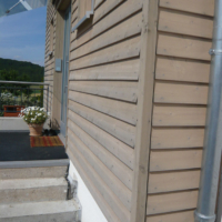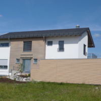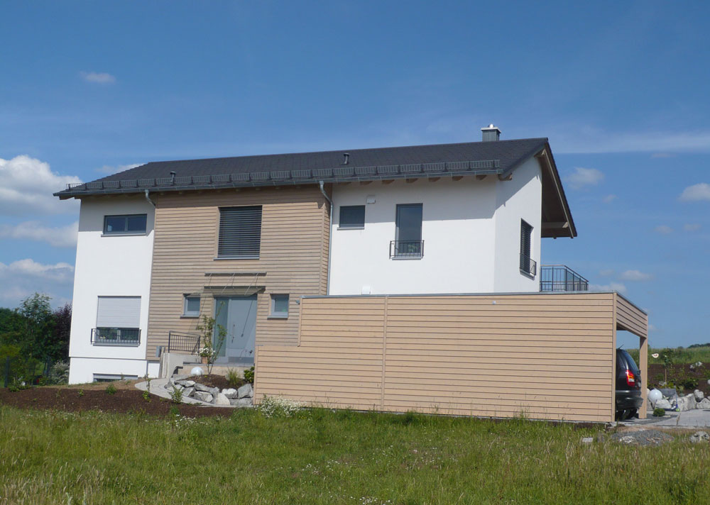 Holzhaus mit Lärcheverschalung und Carport